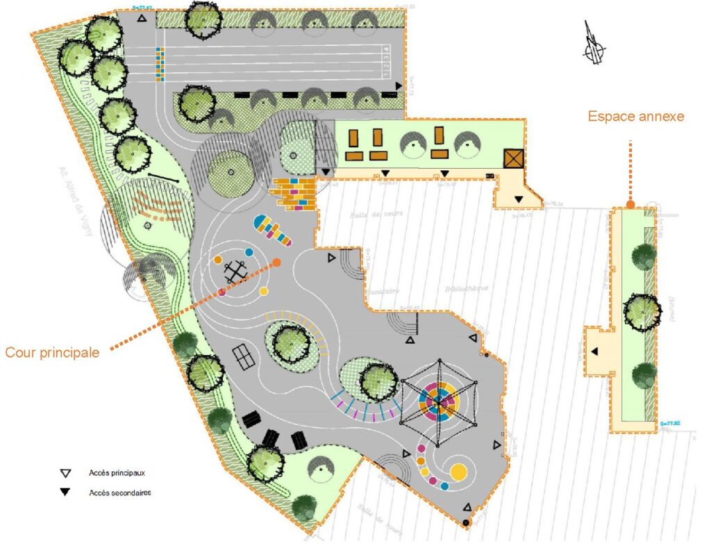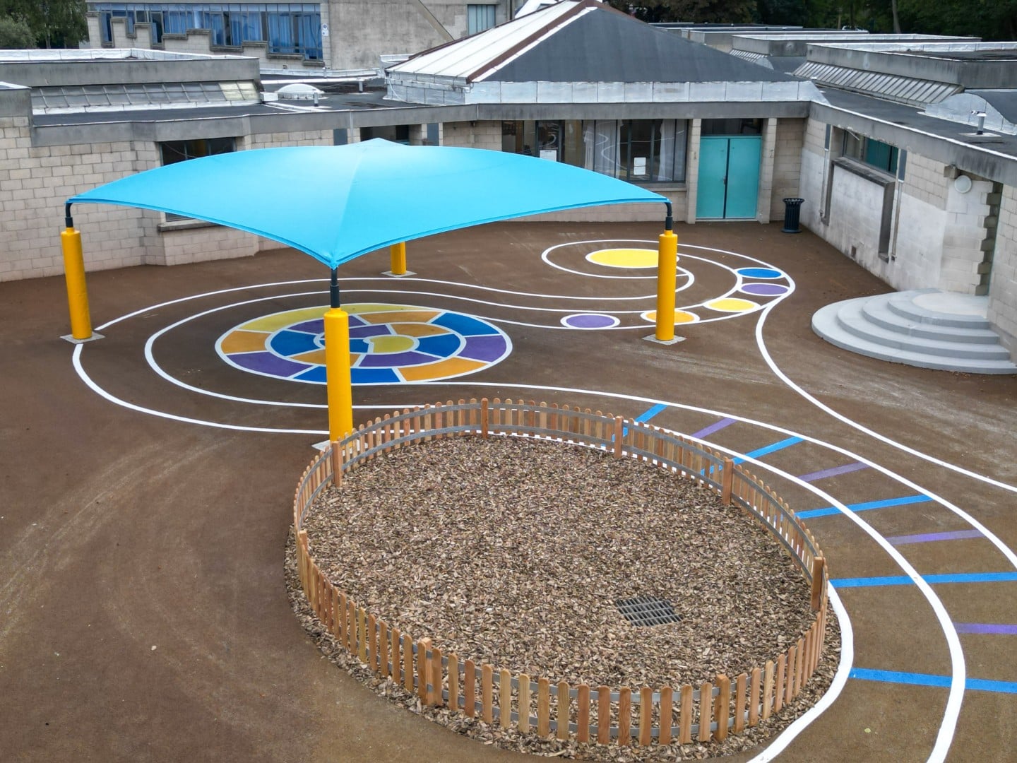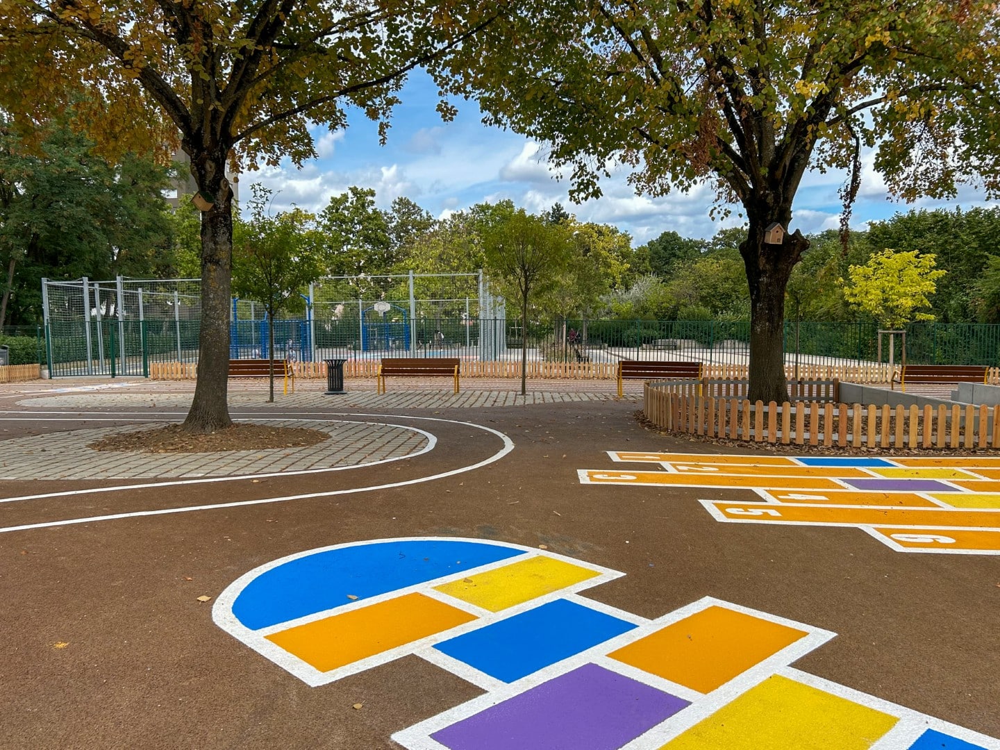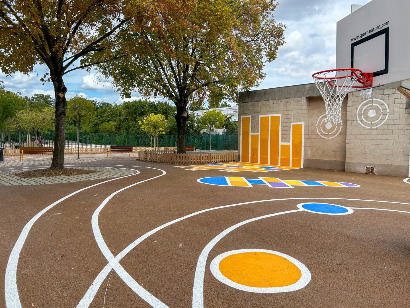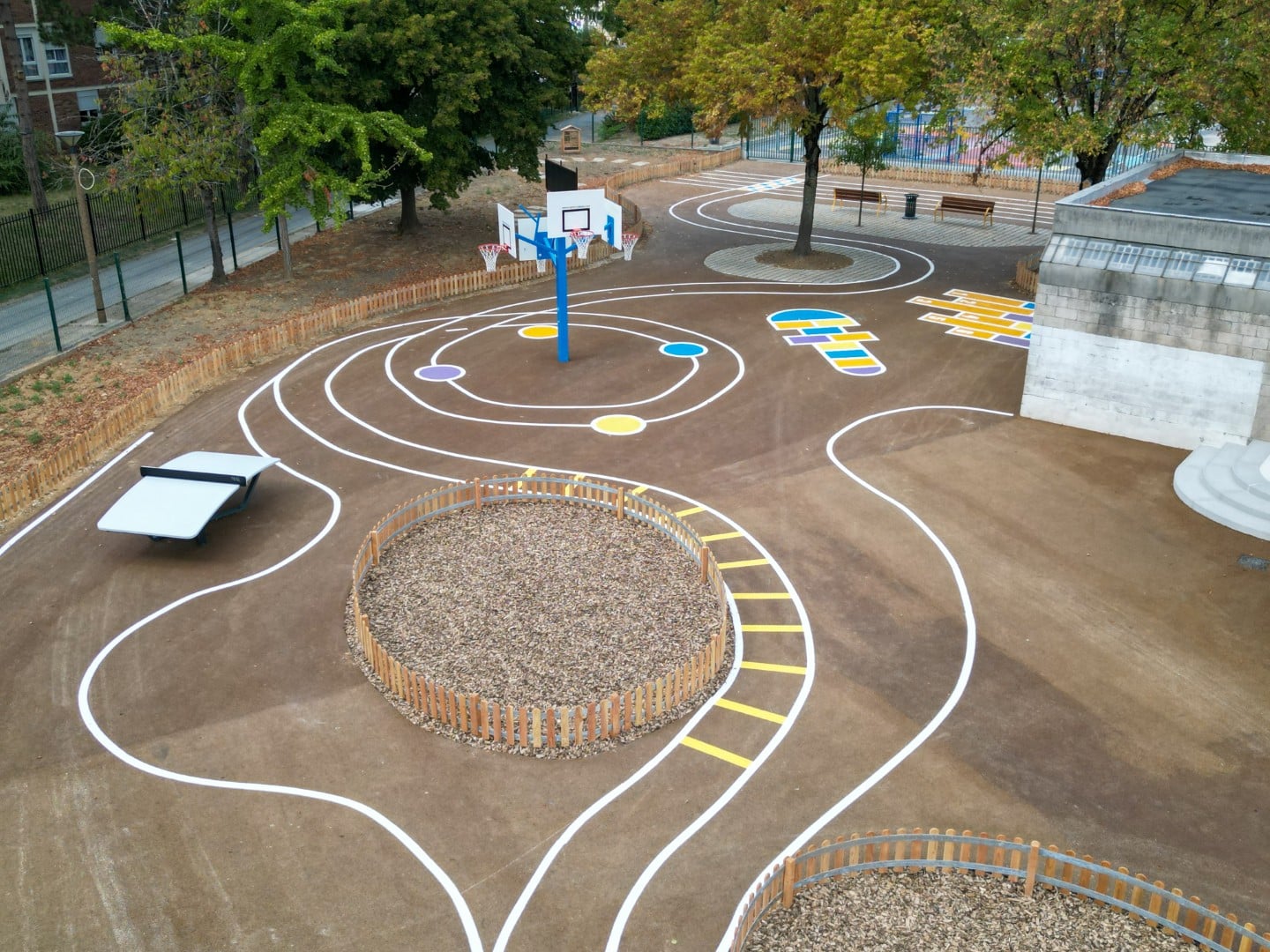 • La création de différents espaces de jeux (piste d’athlétisme, panier de basket, parcours motricité, espace de Teqball, jeux au sol, etc...) ;